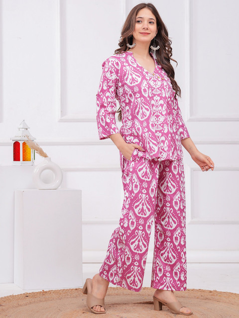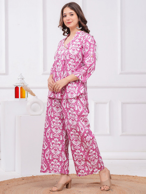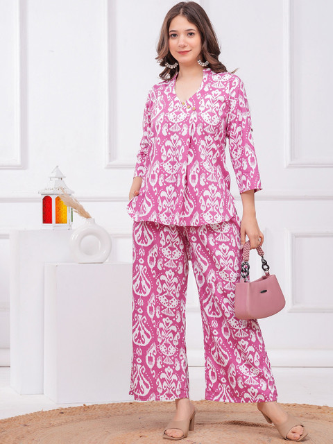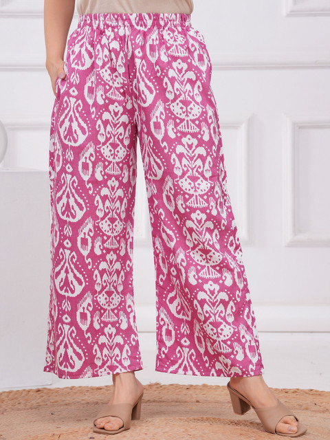 Pink and white printed palazzos, has an elasticated waistband with slip-on closure