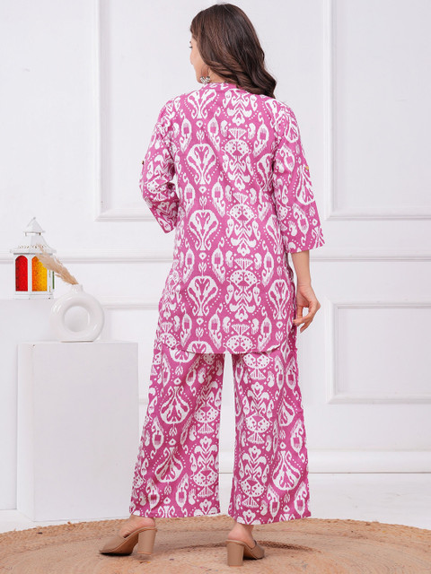 Pink and white printed tunic, has a mandarin collar and three quarter sleeves