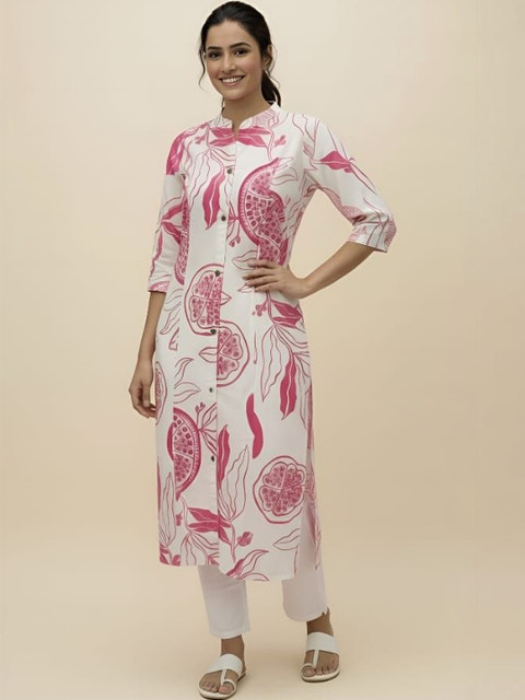 White and pink printed tunic, has a mandarin collar and three-quarter sleeves