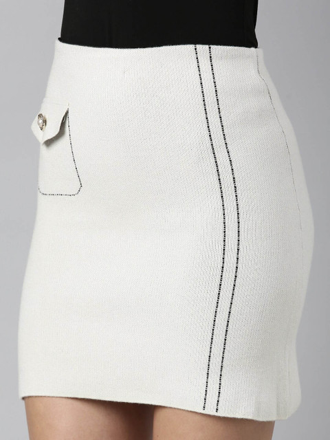 Cream and Black self design pencil mini skirt, has an elasticated waistband with slip on closure, and a straight hem