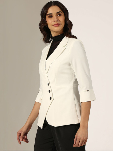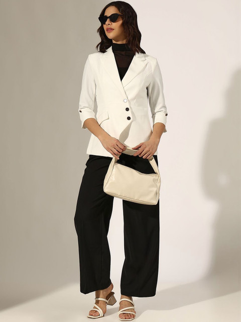 Chic and timeless, the SHOWOFFFF Womens White Asymmetric Blazer is your statement layering piece. Crafted with structured tailoring and elegant button detailing for a crisp, modern silhouette, perfect for desk to dinner transitions. Pair it with black trousers or a sleek midi skirt for a sophisticated, power-dressing vibe.