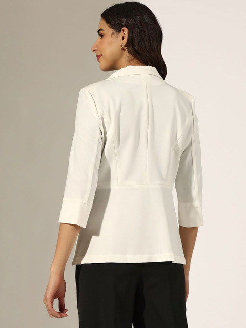 White solid tailored-fit formal blazer, has a peaked lapel, long sleeves, single-breasted with single button closure, two flap pockets, one welt pocket and a double-vented back hem