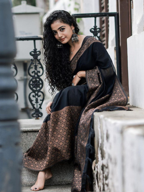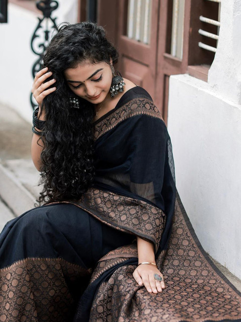 - Black and gold-toned kanjeevaram saree