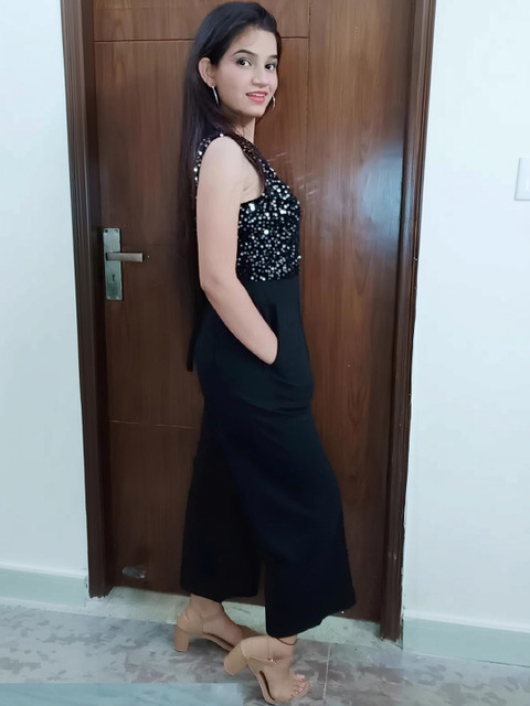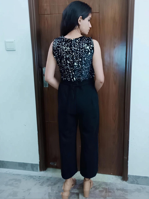 Black solid culotte jumpsuit with embellished ,has a round neck, sleeveless, 2 pockets