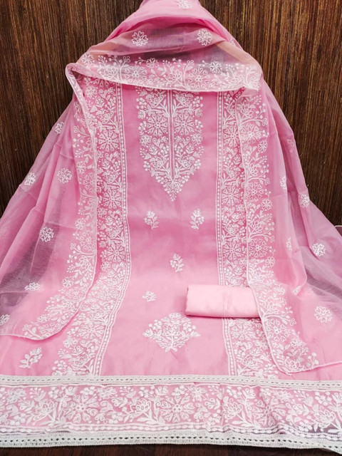 Pink and white floral embroidered thread work unstitched dress material