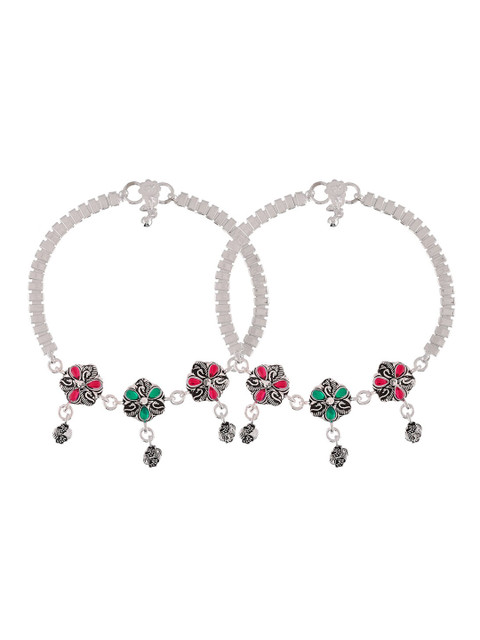 Silver-plated red and green stone studded anklets, has intricate textured details