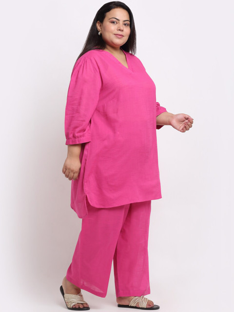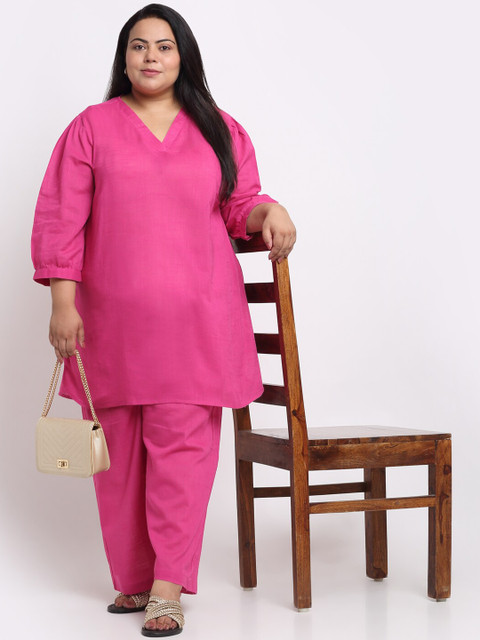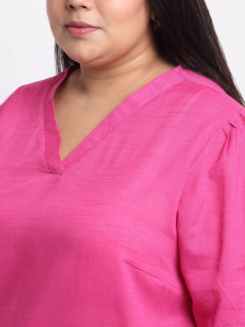 Magenta solid tunic, has a V-neck, three-fourth sleeves, side slits and curved hem