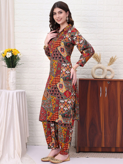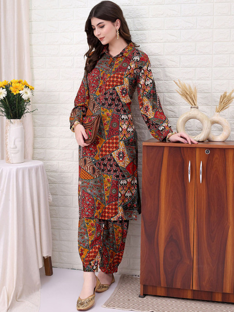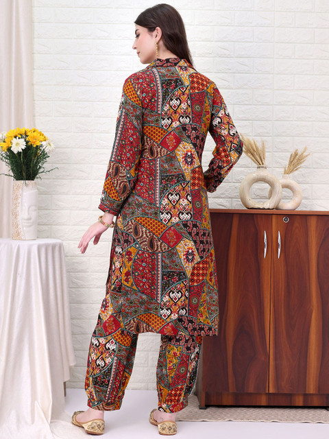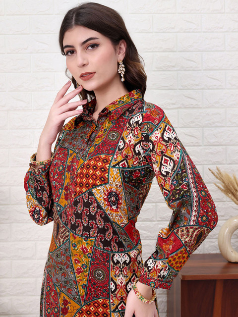 Yellow, red and black printed tunic, has a shirt collar neck and long sleeves, secured with button closure
