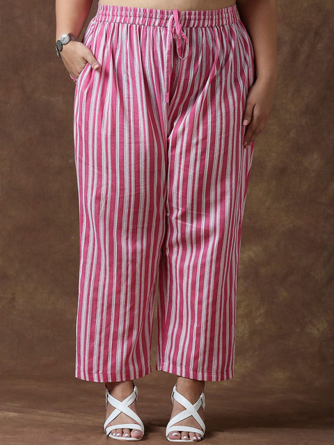 Pink and white striped trousers, has an elasticated waistband with slip-on closure and one pocket