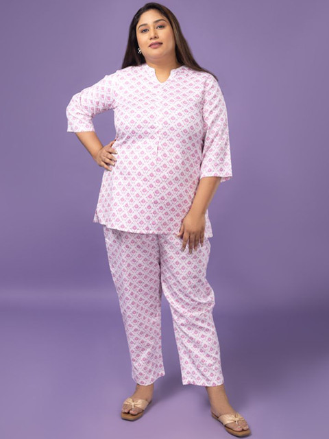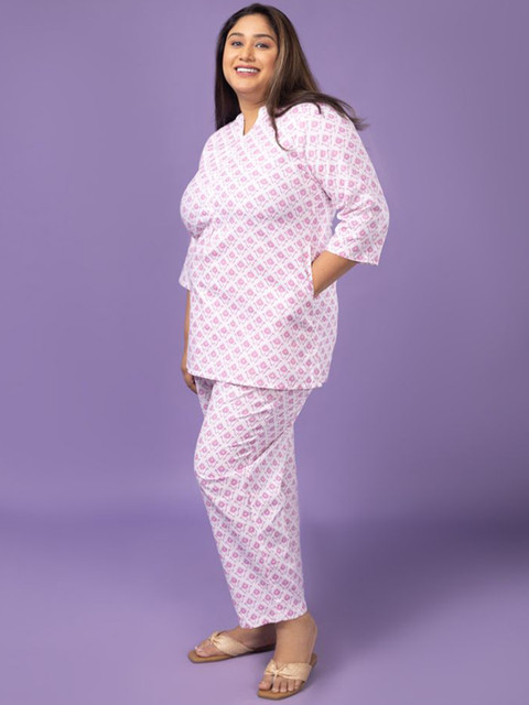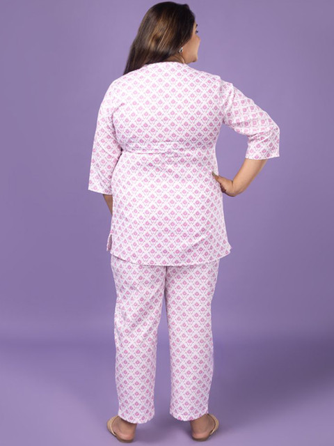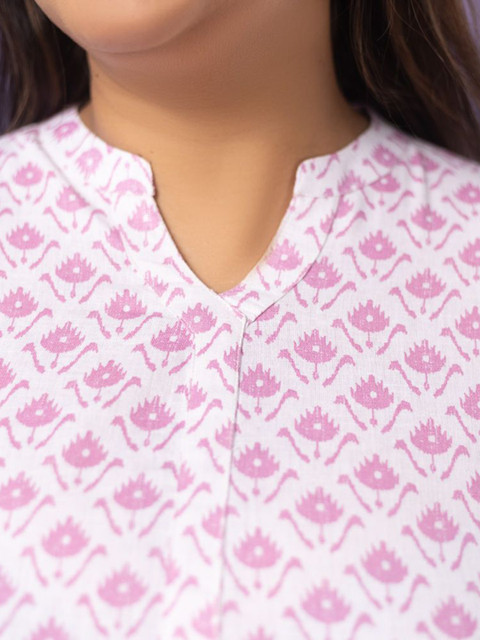 Pink and white printed top, has a mandarin collar, three-quarter sleeves