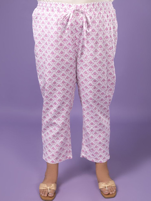 Pink and white printed trousers, has an elasticated waistband with slip-on closure and one pocket