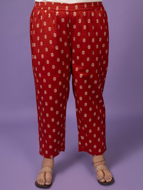 Red printed trousers, has an elasticated waistband with slip-on closure and one pocket