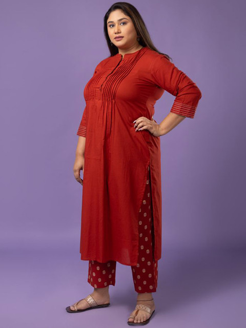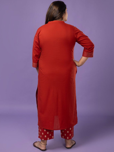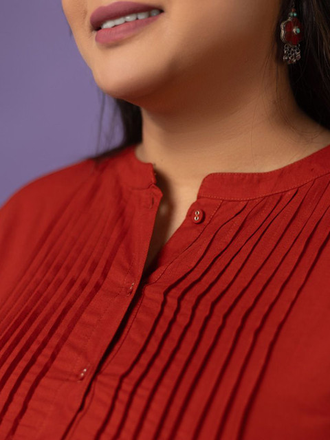 Red solid top, has a mandarin collar, three-quarter sleeves