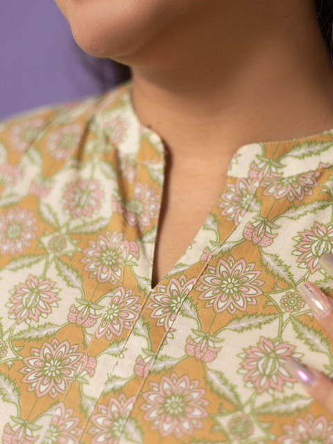 Green printed top, has a round neck with a notch, three-quarter sleeves