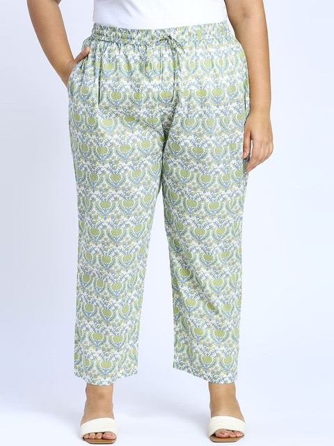 Mint green printed trousers, has an elasticated waistband with slip-on closure and one pocket