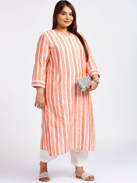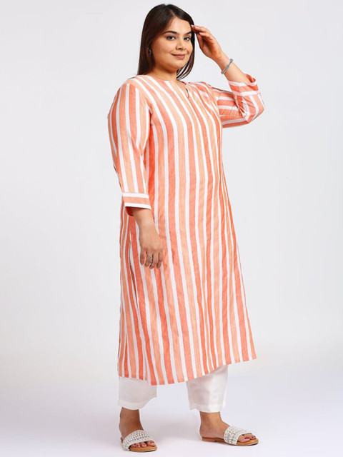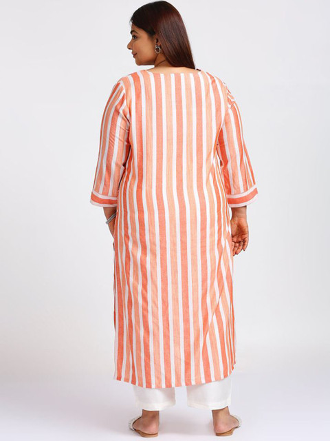 Orange-colored striped top, has a round neck with a notch, three-quarter sleeves