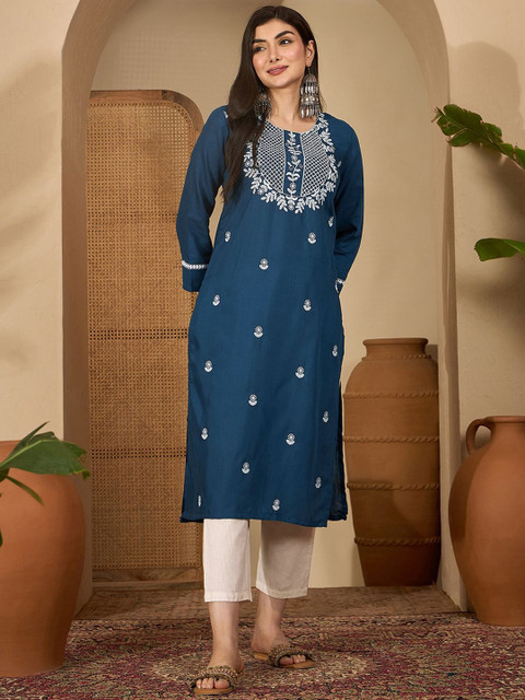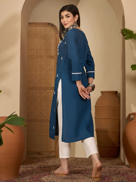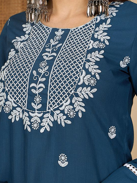 The dress looks very beautiful and the color is lovely. The embroidery design is also nice and gives a traditional look. The fabric feels comfortable to wear. But the chamki (sequins) on the dress are a bit rough while wearing. It would be better if the material around the chamki was softer.
