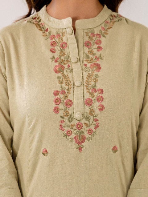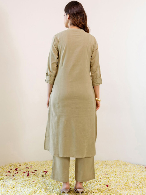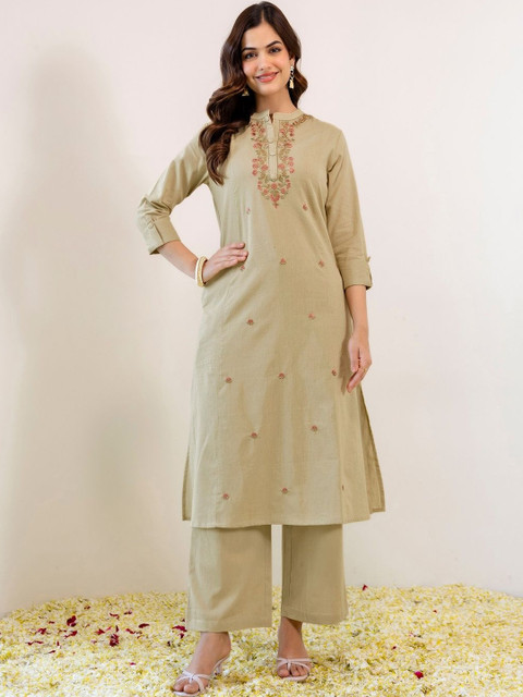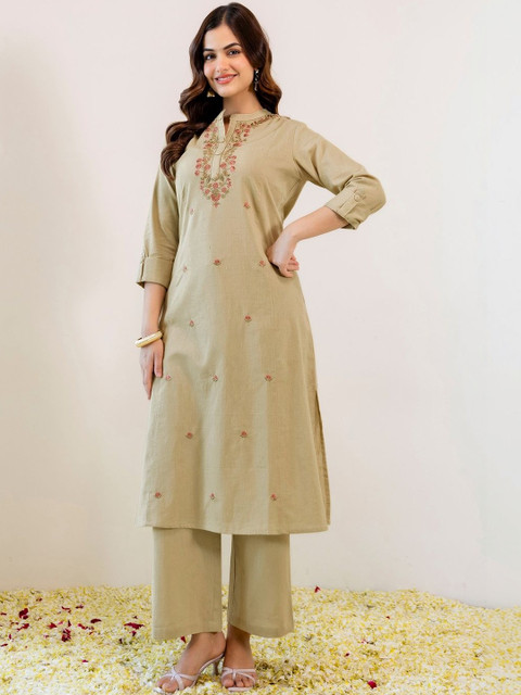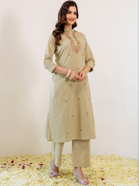 Kurta set includes a Embroidered Straight kurta, Viscose Rayon Bottom, and Viscose Rayon dupatta Crafted from soft Viscose Rayon fabric for all-day comfort Beige ethnic set ideal for Festive occasions Kurta bottom dupatta set with graceful silhouette Wash care: Dry Clean