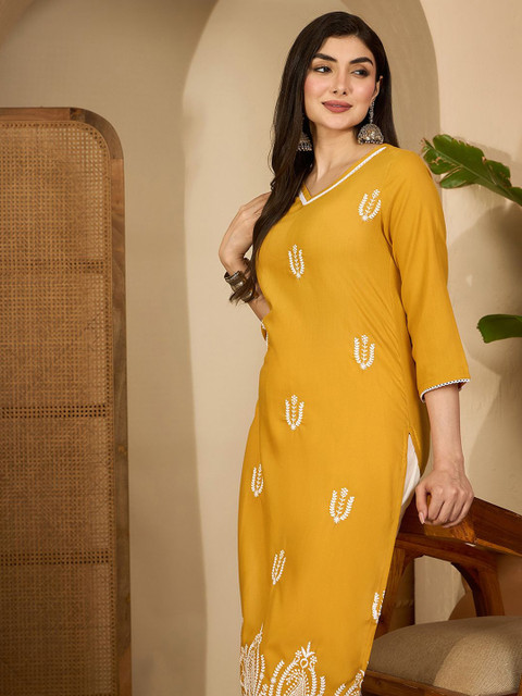 The dress looks very beautiful and the color is lovely. The embroidery design is also nice and gives a traditional look. The fabric feels comfortable to wear. But the chamki (sequins) on the dress are a bit rough while wearing. It would be better if the material around the chamki was softer.