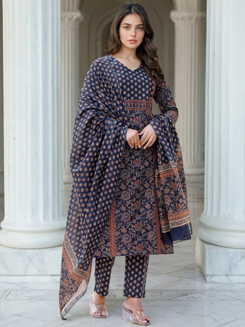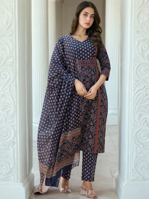 Navy Blue, Red, Grey Printed Kurta with Trousers & Dupatta