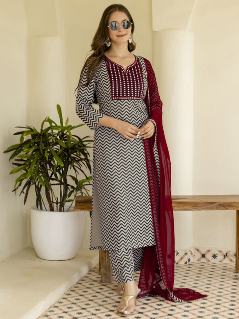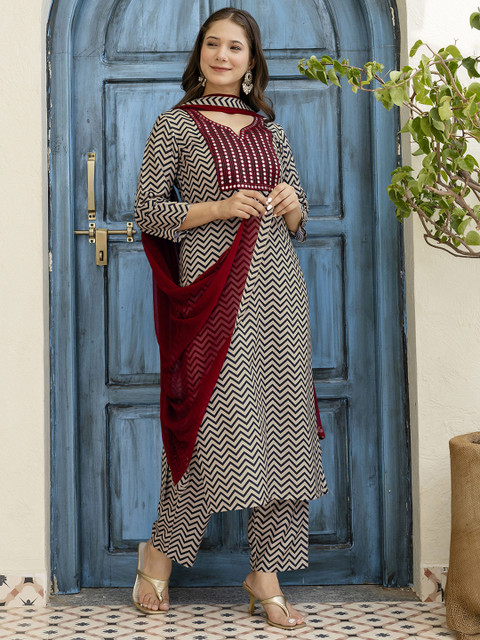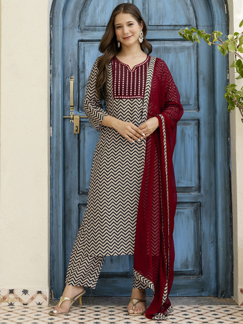 Black, Beige, Maroon Printed Kurta with Trousers & Dupatta