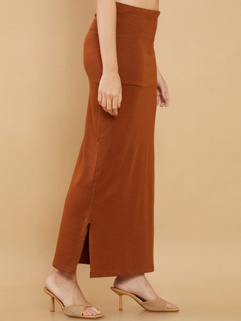 Brown solid maxi length petticoat, has waist band with drawstring closure and side slit