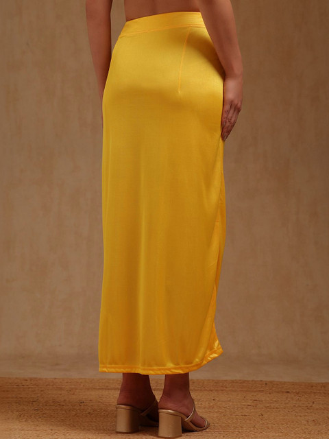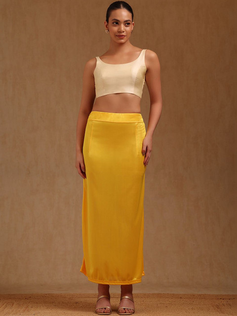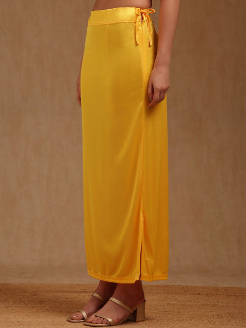 Yellow solid saree shapewear has an elasticated waistband with inner drawstring closure, seamless and a side slit