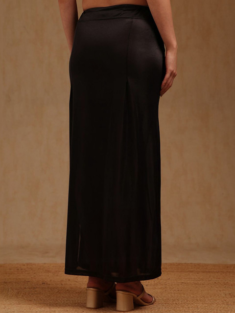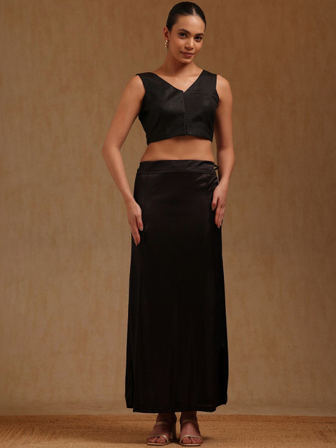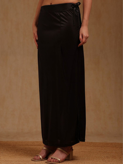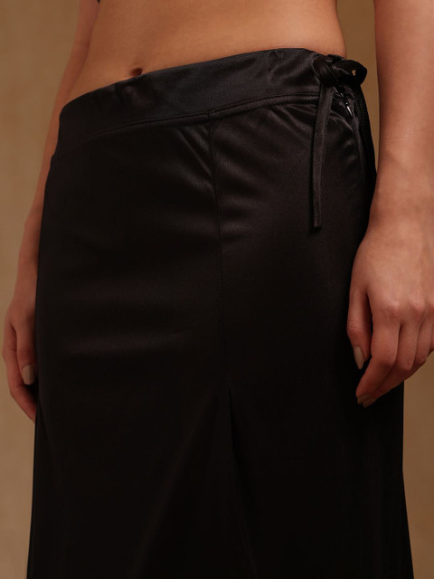 Black solid saree shapewear has an elasticated waistband with inner drawstring closure, seamless and a side slit