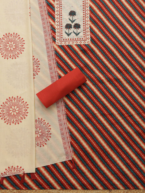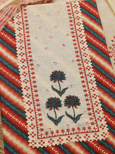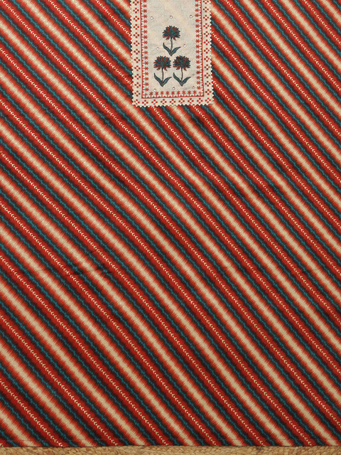 Rust, cream and blue striped unstitched dress material, has sequinned detail