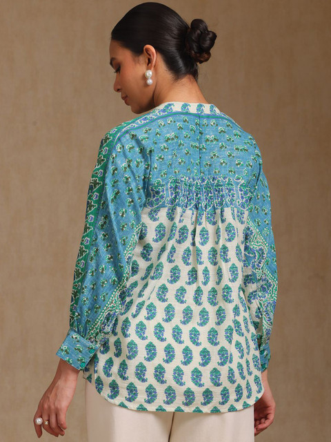 Teal printed tunic ,has a mandarin collar, long sleeves, button closure