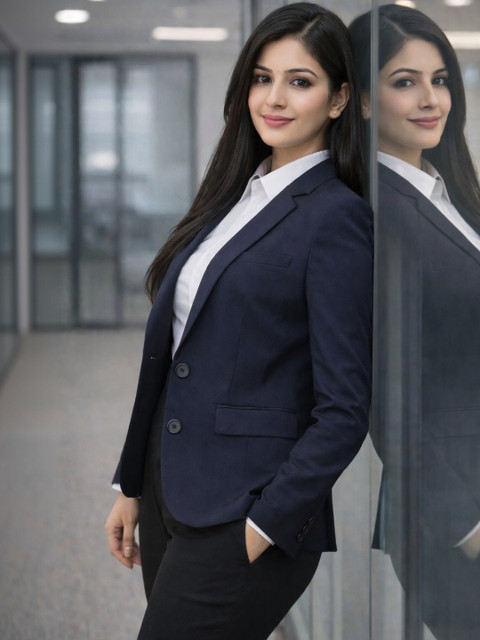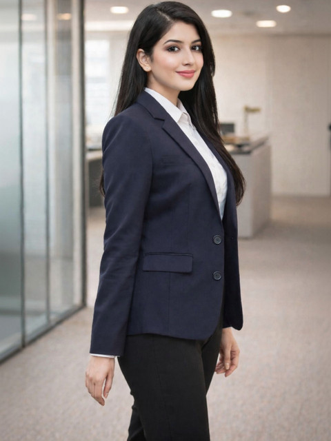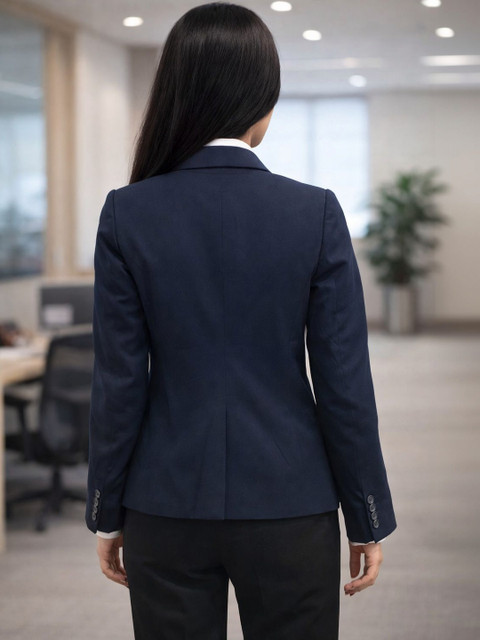 Navy Blue solid slim-fit casual blazer, has a notched lapel, long sleeves, single-breasted with single button closure, two flap pockets, one welt pocket and a single vent back hem
