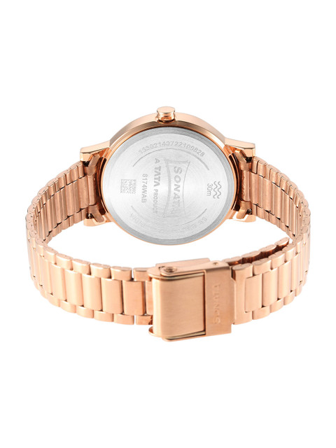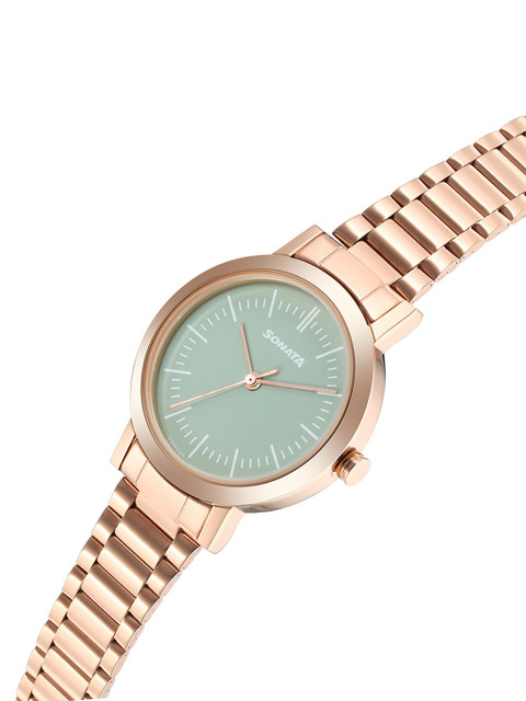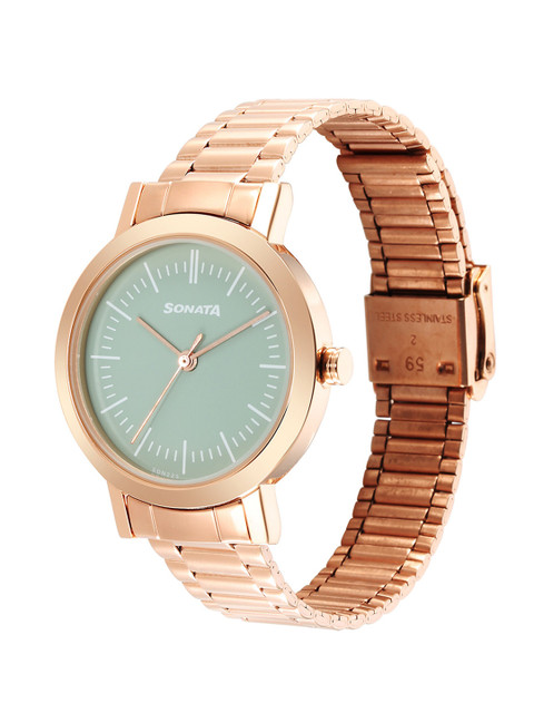 A modern classic, this Sonata watch features a sleek green dial framed by a rose gold case and matching stainless steel strap. With minimalist baton-style markers and refined hands, the design is clean, bold, and fashion-forward. The slim profile and understated elegance make it ideal for both everyday styling and special occasions. A perfect blend of subtle color and metallic shine, this timepiece is all about effortless sophistication.
