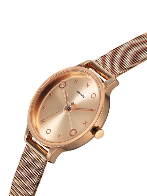 Add a playful yet refined touch to your wardrobe with the Sonata Play watch. Inspired by the classic XO game, the dial features a radiant rose gold finish with unique X and O hour markers, adding a fun twist to your timekeeping. The matching rose gold stainless steel mesh strap pairs seamlessly with the sleek round case, offering a blend of modern style and comfort. Bold, minimal, and fashion-forward – this watch is a creative expression of individuality.