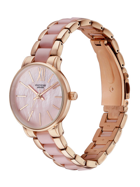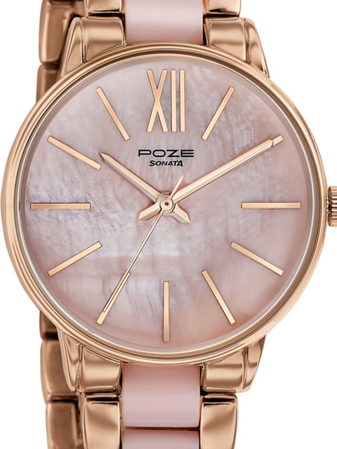 Elegant and timeless, the Sonata Poze watch combines sophisticated design with a touch of modern femininity. The stunning mother-of-pearl dial is enhanced with slim rose gold-tone hour markers and a bold Roman numeral, exuding refined charm. Its two-toned strap blends polished rose gold metal with soft pink links, offering both comfort and luxury. A perfect choice for women who appreciate subtle elegance in everyday style.