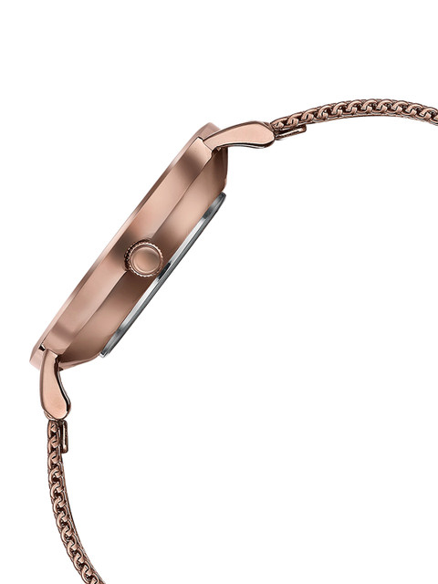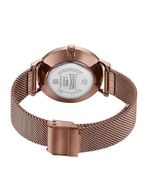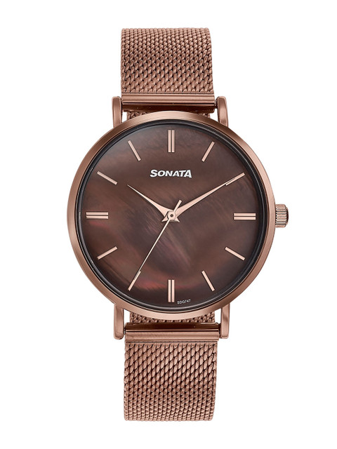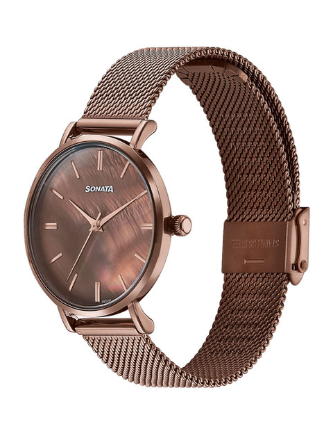 Striking the right chord between elegance and modern minimalism, this Sonata watch features a rich brown mother-of-pearl dial that glows subtly under light. Sleek rose gold hands and baton markers blend seamlessly with the dial, while a matching brown stainless steel mesh strap completes its refined tone-on-tone appeal. Designed for the contemporary woman, it is both versatile and stylish – a perfect pick for elevating daily looks or enhancing an evening ensemble.