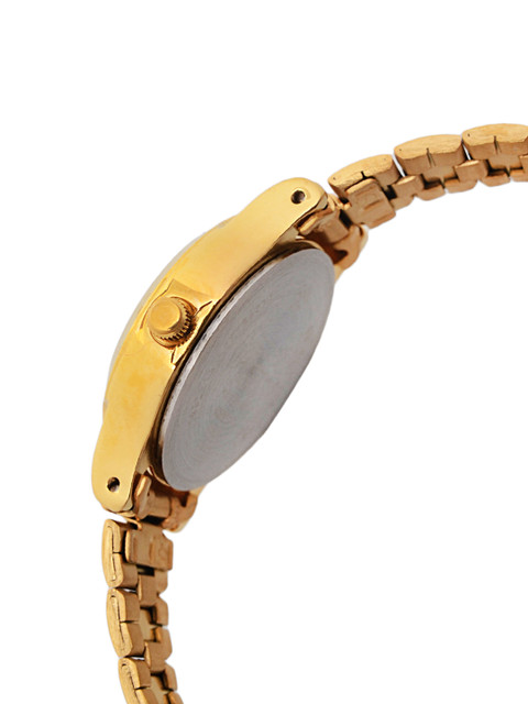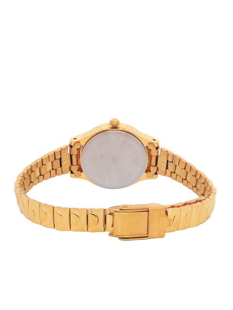 Step into subtle sophistication with a design that speaks volumes through its simplicity. This beautifully crafted piece features a warm champagne dial that complements the richness of the polished gold-tone body. The soft gleam of the dial adds a gentle glow to your wrist, making it an effortless companion for both everyday moments and celebratory evenings.The gold stainless steel strap is designed to offer not just durability, but also a seamless shine that enhances your overall look. Whether paired with ethnic attire or western ensembles, the timeless gold finish makes it an adaptable style statement. Designed with refined elegance, it balances grace, comfort, and charm in one sleek creation.