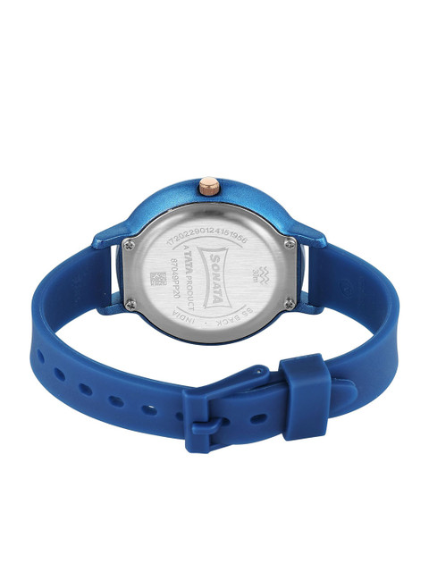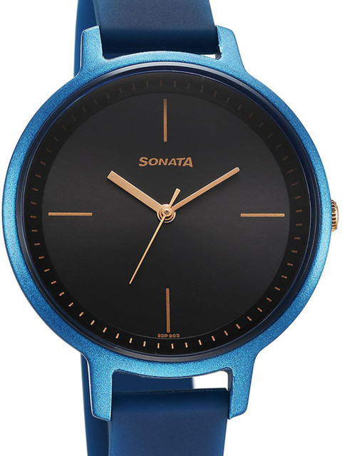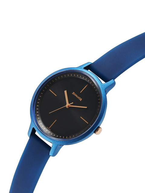 Striking a perfect balance between elegance and modernity, this Sonata Splash watch stands out with its bold black dial and radiant rose gold accents. Minimal markers and sleek hands in a refined rose gold finish contrast beautifully against the dark backdrop. Housed in a metallic blue case and paired with a matching plastic strap, this watch offers comfort without compromising on style-ideal for women who prefer understated sophistication with a splash of color.