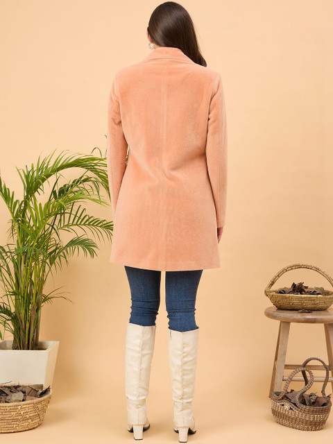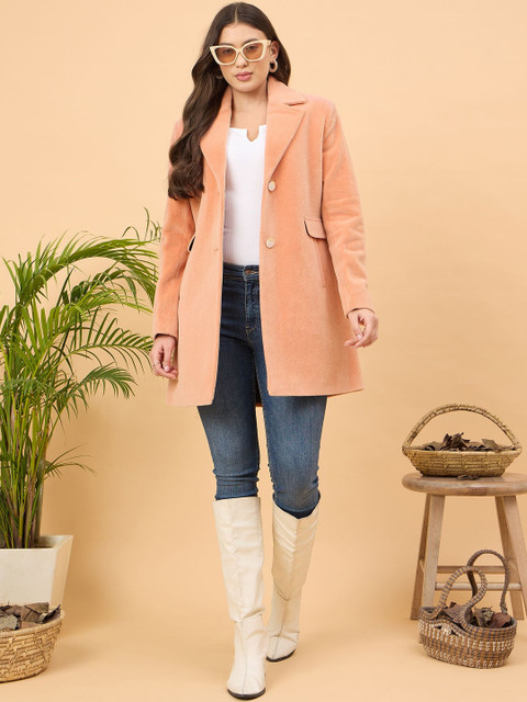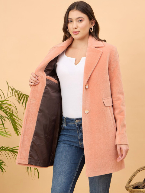 Peach-coloured solid single-breasted overcoat, has notched lapel collar, long sleeves, button closure, two pockets, a straight hem