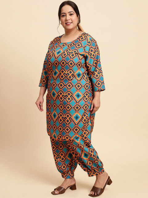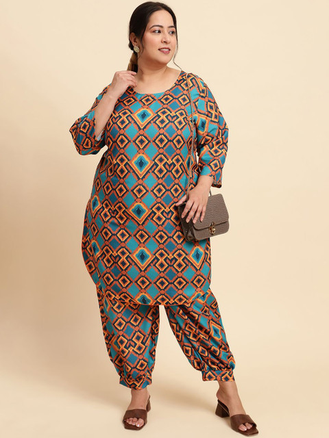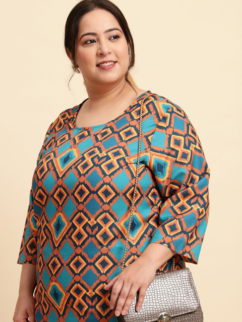 Blue & Orange Printed Tunic , has Round Neck, Three Quarter sleeves, full placket closure and regular waist hem