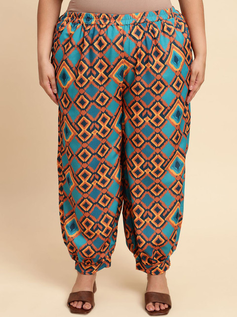 Blue & Orange Printed mid-rise Trousers, has Slip-On closure and flared hem