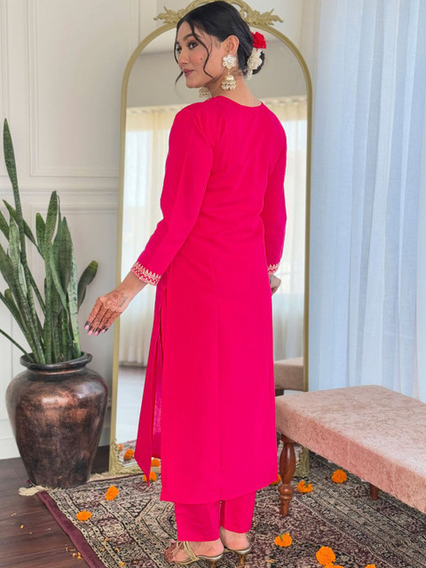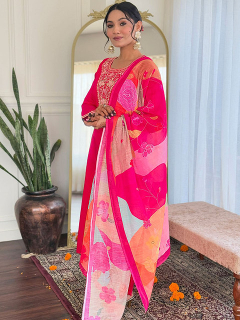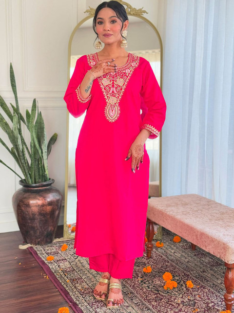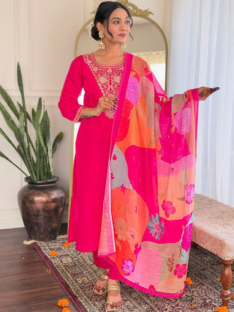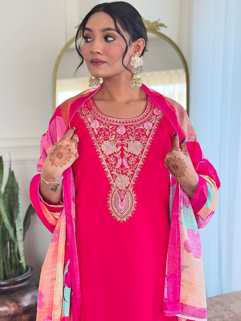 Red, Beige, Pink Embroidered Kurta with Trousers & Dupatta