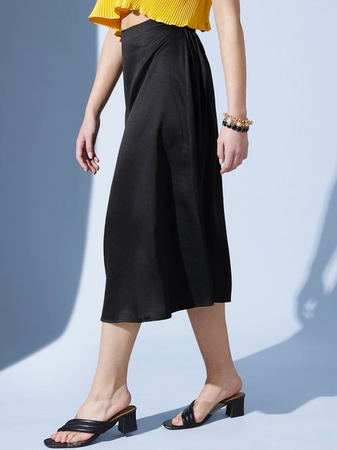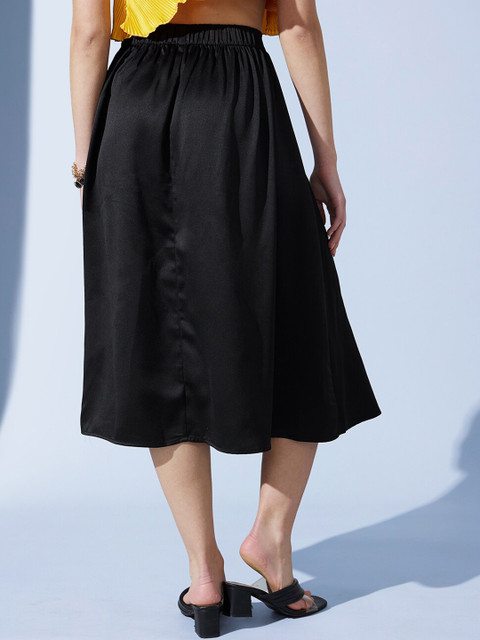 Black Solid A-line midi skirt, has an elasticated waistband with slip-on closure, and a Flared hem, 1 side pocket