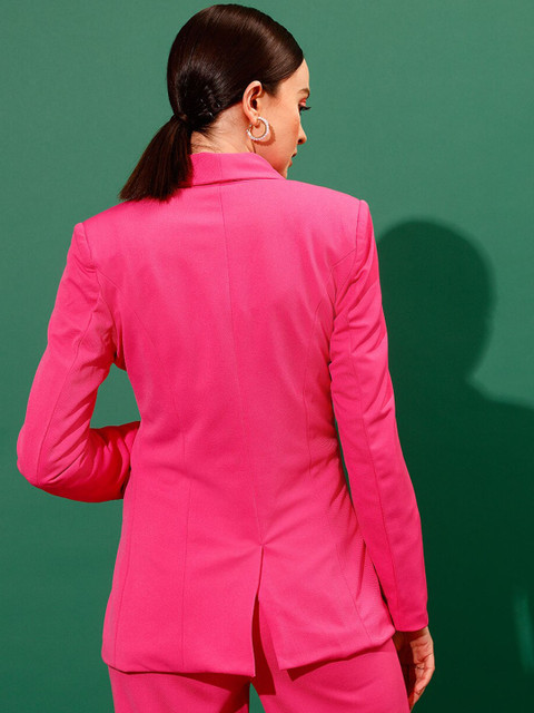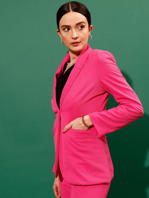 Pink solid slim-fit formal blazer, has a shawl collar, single-breasted with a double button closure, long sleeves, two flap pockets and an attached lining