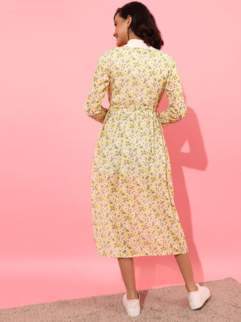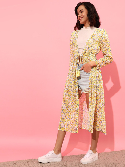Yellow and grey printed tie-up longline shrug ,has long sleeves, straight hem