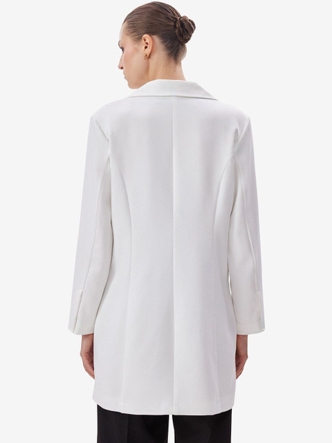White solid regular-fit casual blazer, has a notched lapel, long sleeves, double-breasted with double button closure, two flap pockets, one welt pocket and a double-vented back hem