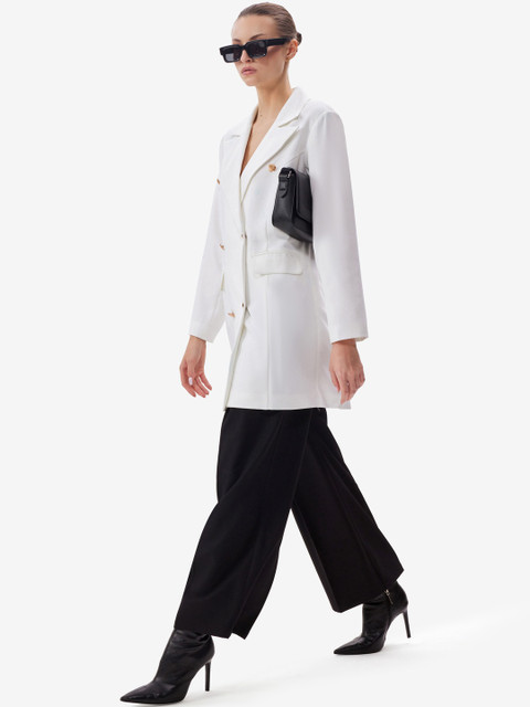 A modern power essential, this white double-breasted blazer brings effortless sophistication to both work and evening wardrobes. The sharp peak lapels and gold-tone buttons add a tailored, statement finish, while the clean, cuffless sleeves keep the look sleek and contemporary. Style it with wide-leg trousers for a confident, polished silhouette, or layer over a slip dress for an elevated, fashion-forward edge. Perfect for occasions that call for understated elegance with strong tailoring.