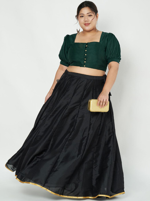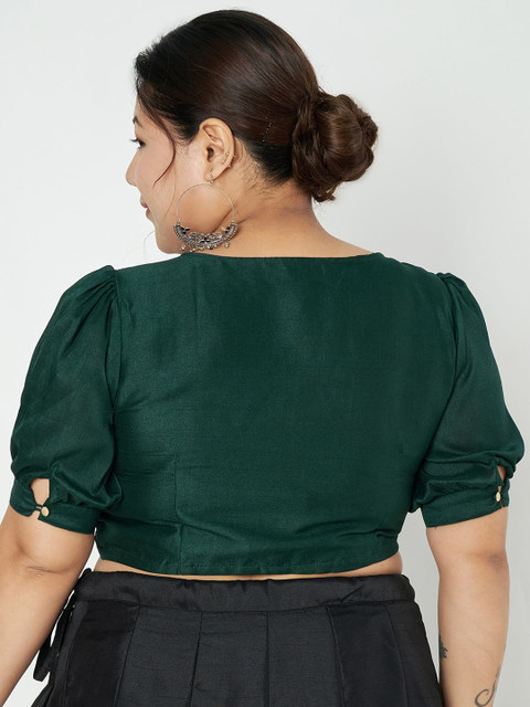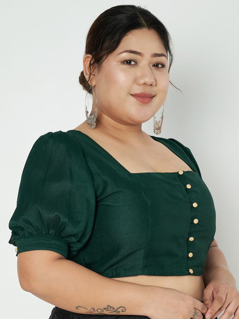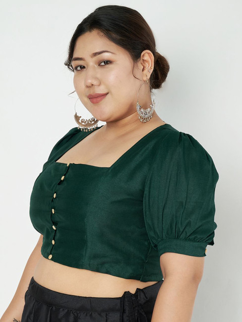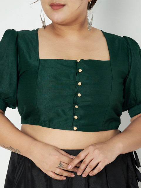 Green solid blouse has a square-neck, short sleeves, and hook & eye closure detail