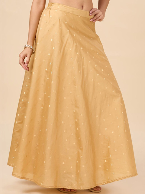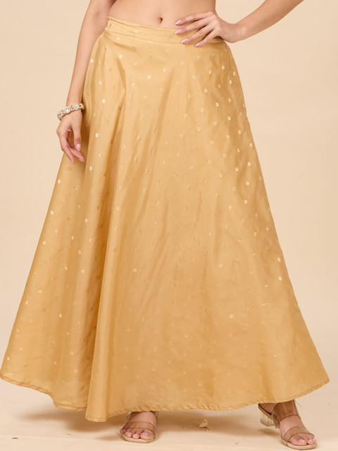 Gold printed flared maxi skirt, has an elasticated waistband with zip closure, and a flared hem