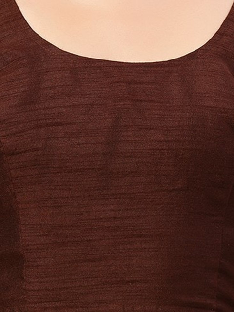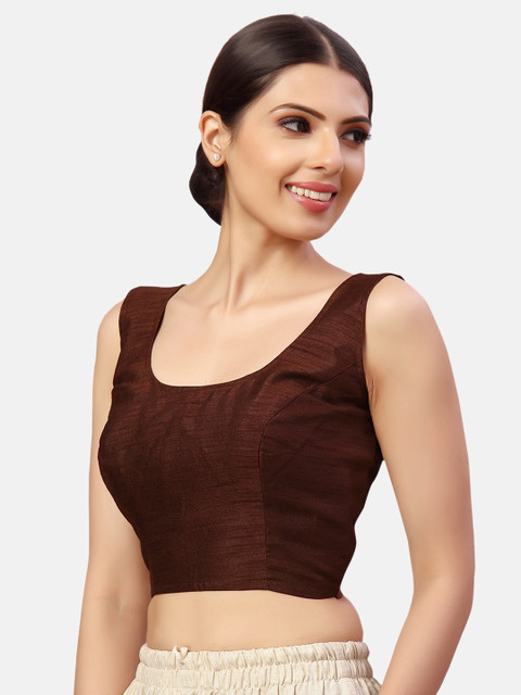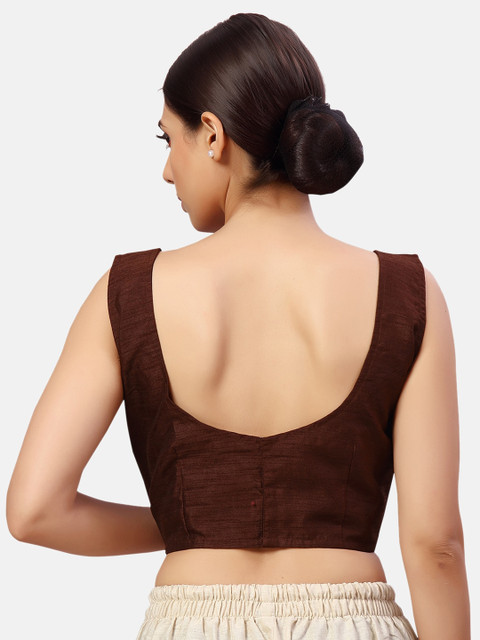 Brown solid blouse has a round neck, sleeveless, and hook & eye closure