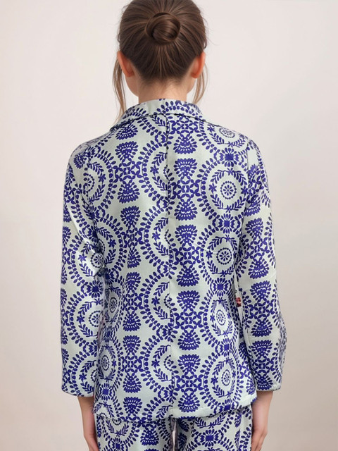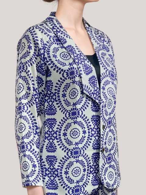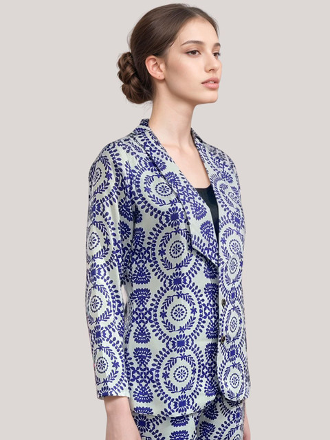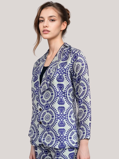 Grey and blue printed regular-fit smart-casual blazer, has a notched lapel, long sleeves, single-breasted with double button closure, single-vented back hem